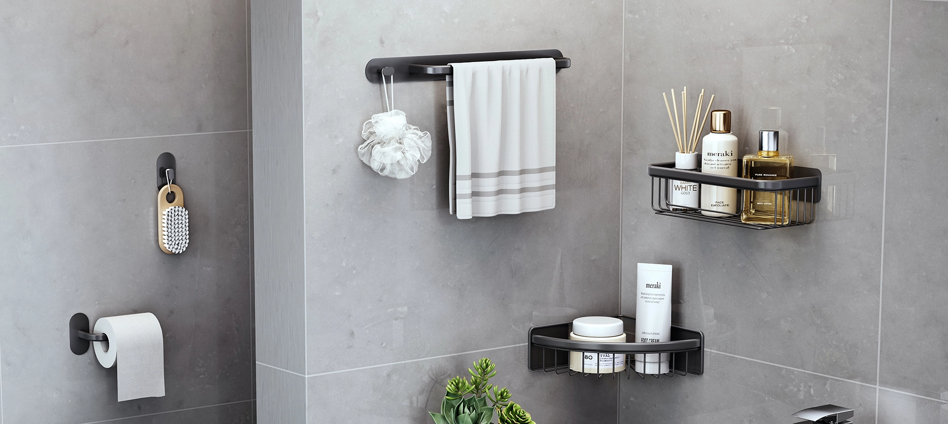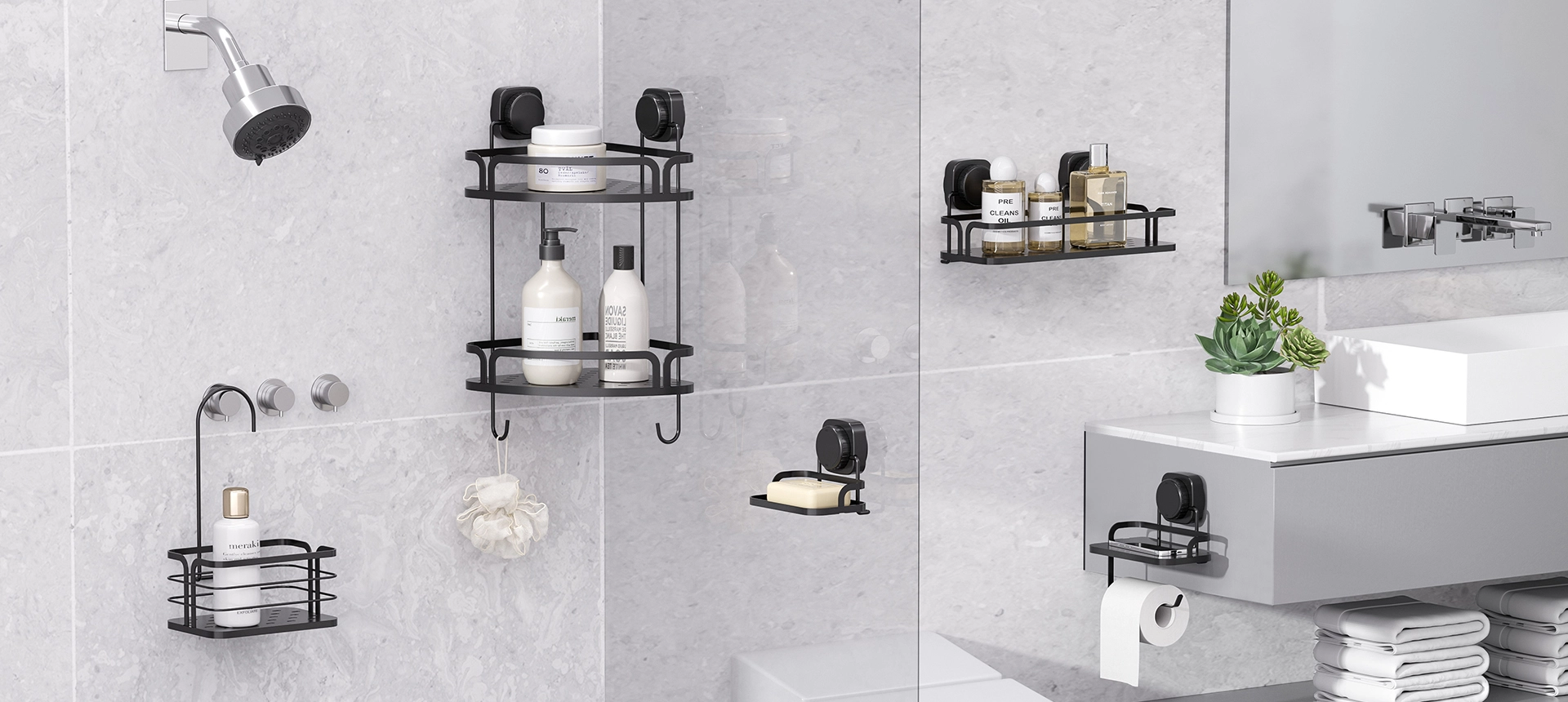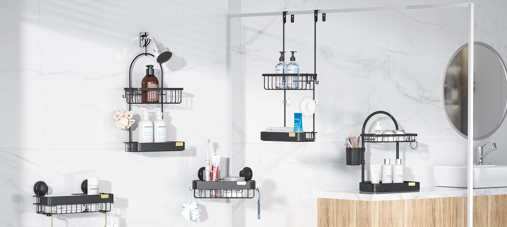 涵盖花洒架、角落架、皂架、毛巾杆、纸巾架、挂钩。