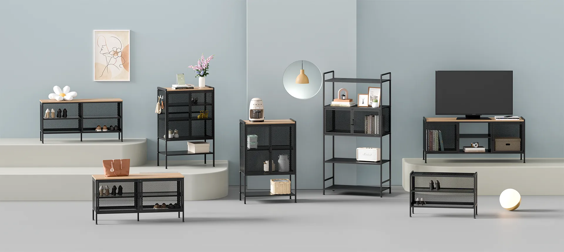涵盖挂衣架、玄关桌、边桌、茶几、电视柜、置物架。